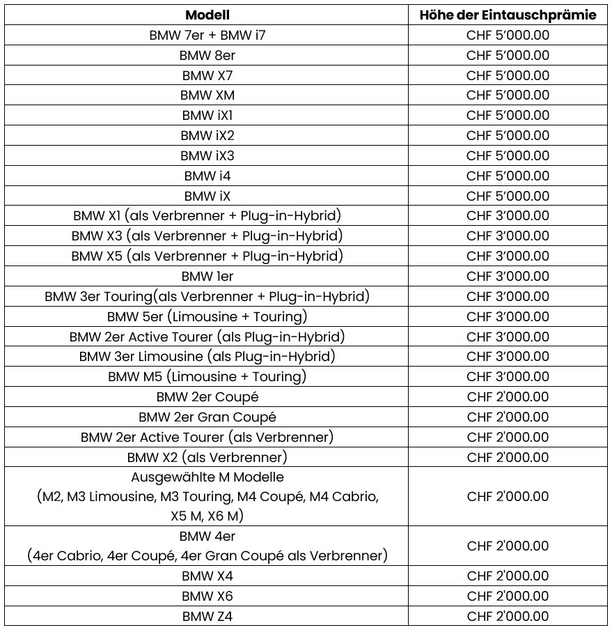 Profitieren Sie jetzt beim Eintausch Ihrer bisherigen Fremdmarke von einer attraktiven Eintauschprämie von CHF 2'000.– und entdecken Sie die Vielfalt der BMW Modellwelt. Ob beispielsweise das sportliche BMW 2er Coupé, das elegante BMW 2er Gran Coupé, der vielseitige BMW 2er Active Tourer, die sportliche BMW 3er Limousine, ausgewählte kraftvolle BMW M Modelle, der charakterstarke BMW Z4 Roadster oder die ausdrucksstarken BMW 4er Modelle als Gran Coupé, Coupé oder Cabrio – jedes Fahrzeug steht für pure Fahrfreude und unverwechselbaren Stil.